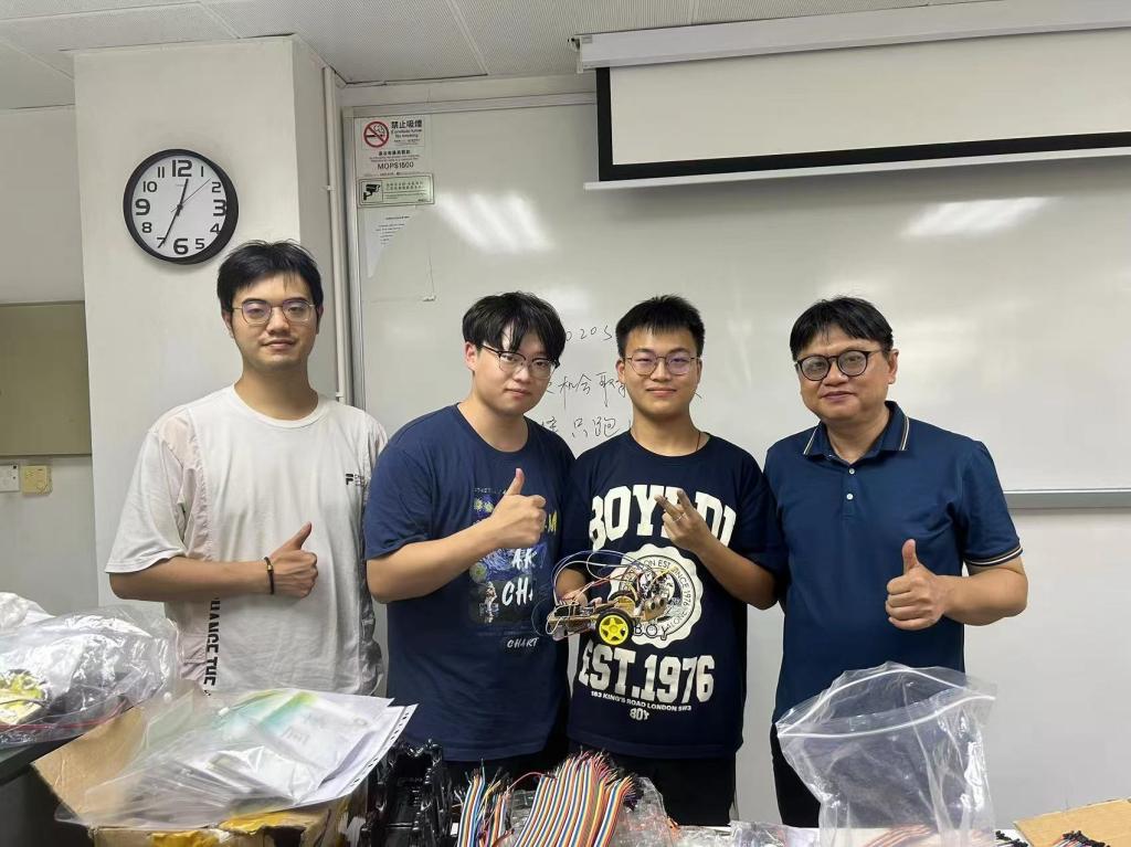 Yao Junyan (second from the left) took a commemorative photo with the professor and teaching assistant during his exchange program courses at Macau University of Science and Technology.